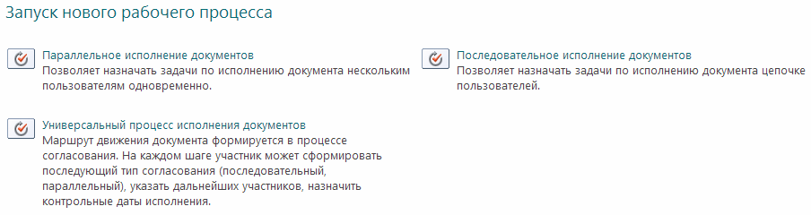 В зависимости от типа выбранного рабочего процесса откроется та или иная форма запуска рабочего процесса. Описание запуска представленных рабочих процессов для выбранного элемента представлено в следующих разделах руководства.