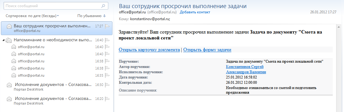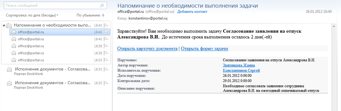 После создания на портале новой задачи или запуска рабочего процесса, сотрудникам в зависимости от назначенных сроков выполнения задачи на электронный адрес будут приходить уведомления о времени, оставшемся до срока выполнения назначенной задачи. В письме сотрудник может ознакомиться с текстом и описанием поручения, автором, исполнителем, датой создания и контрольной датой выполнения поручения. Также на форме письма доступны ссылки для быстрого перехода к открытию карточки документа и формы задачи.